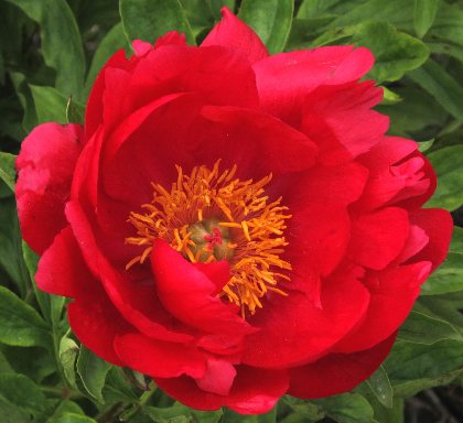 Many smooth petals of shining, intense scarlet red surround a small center of light yellow stamens and velvety white carpels, filaments red. Large flowers set close to the bush, medium low, 24-26 inches. Smooth leaflets, medium green, good grower. May shut down when stressed by heat and drought, the subsequent flowering performance not diminished. Parents (Karl Rosenfield x Good Cheer). Named by Werner Reinermann, Schoppinger Iris Garden of Germany.