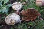 Cap 4-15 cm broad, convex at first, then plane in age, viscid, margin striate; color variable: from buff-yellow (usually darker at the disc) to dark brown; universal veil remnants forming pointed warts. Odor mild. |
