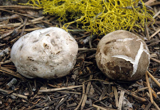 Fruiting body sessile, up to 4.0 cm tall, 5.0 cm broad, subglobose to cushion-shaped, the base often flattened, pleated, attached to the substrate via a mycelial cord; exoperidium when young, approximately 1.0 mm thick, whitish, minutely matted-tomentose (use hand lens), soon tinged light-brown to grey-brown, occasionally dark-brown, becoming patchy areolate, sometimes deeply incised in dry weather; endoperidium persistent with the exoperidium, up to 3.0 mm thick when fresh, hard and rigid when dry; spores released via cracks in the peridium or from rodent-gnawed holes; gleba when young, soft, white, becoming pale yellow-brown, then medium to dark-brown; odor often unpleasant during glebal maturation, powdery when dry; taste of immature gleba mild; subgleba and sterile base absent.